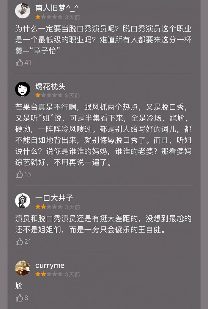 上周日中午刚刚开播的综艺节目《听姐说》在豆瓣还未开分,却获得了清一色的一星评论。面对网友如滔滔江水的吐槽,要评论这档节目或许用一个“尬”字就能总结。