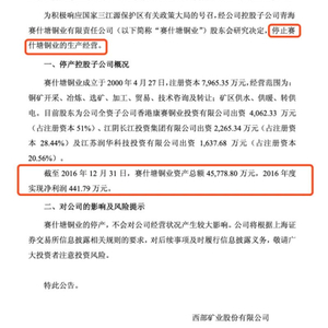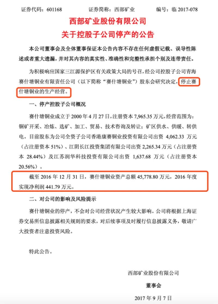 根据西部矿业于2017年9月7日披露公告,为积极响应国家三江源保护区有关政策大局的号召,经公司控股子公司赛什塘铜业股东会研究决定,停止赛什塘铜业的生产经营。