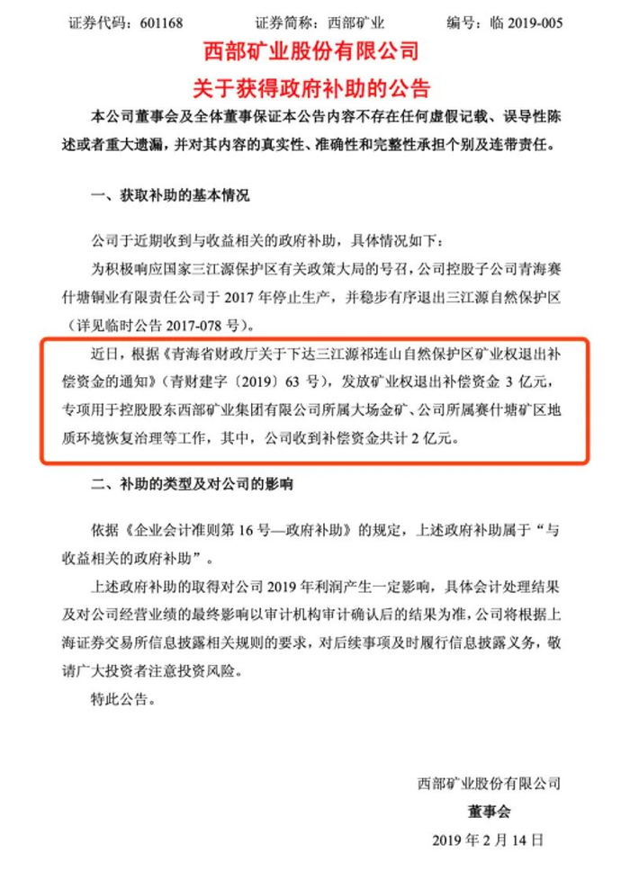 根据《青海省财政厅关于下达三江源祁连山自然保护区矿业权退出补偿资金的通知》(青财建字〔2019〕63 号),发放矿业权退出补偿资金3亿元,专项用于控股股东西部矿业集团有限公司所属大场金矿、公司所属赛什塘矿区地质环境恢复治理等工作。其中,公司收到补偿资金共计2亿元。