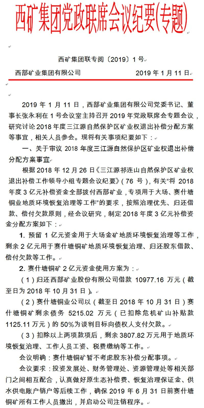 其提供的一份名为《西矿集团党政联席会议纪要(专题)》的红头文件显示,2019年1月11日,西矿集团召开了内部党政联席会议,其会议纪要显示,青海省政府拨付的3亿元补偿资金中的2亿元用于赛什塘铜业矿业权退出补偿资金,其中,10977.16万元用于归还西部矿业的借款,赛什塘铜业以赛什塘铜矿剩余债务5215.02万元的50%为谈判目标向债权人支付欠款;剩余3807.82万元用于环境恢复、人员工资、税费缴纳等工作,供水供电销户等后续工作。