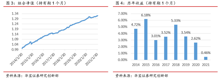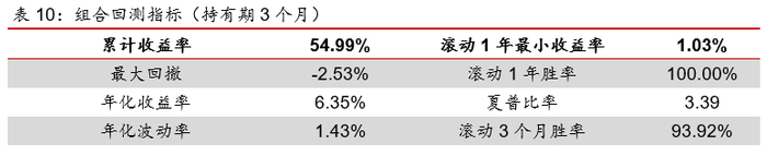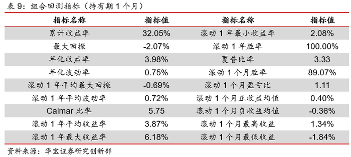 从回测结果来看,滚动1个月胜率89%,盈亏比1.11,长期来看滚动1年平均收益率3.87%,滚动1年最小收益率2.08%,这样的组合基本满足期限1个月的需求。