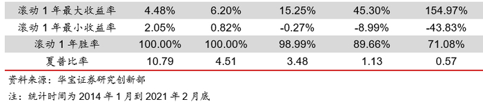 通过对前文底层资产的收益风险以及滚动持有胜率分析,可以发现单一的类型并不能满足我们构建组合的目的,尤其是缺乏能够匹配持有时间1年、2年这类时间维度的绝对收益型产品。对绝对收益的概念进行量化处理,我们希望不同期限的组合能在滚动持有对应期限的情况下亏损概率很低,即胜率达到90%左右,且盈亏比要大于1。