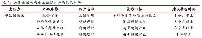 持有期为1个月的产品,重点在于对流动性的管理和波动的控制,因此主要配置货币基金与短期纯债。