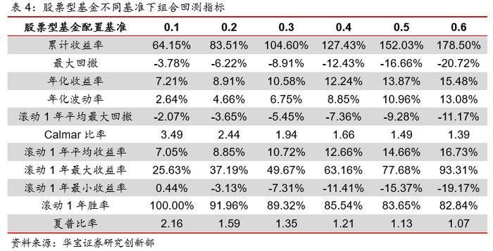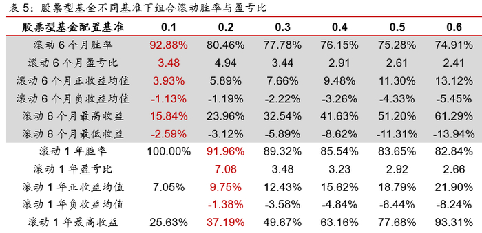 从股票型基金指数不同基准遍历的情况来看,对于持有期6个月的基金投顾产品,股票型基金围绕基准10%的动态配置基本就能满足需求。回撤结果显示滚动持有6个月的胜率接近93%,且盈亏比3.48,滚动持有6个月的最低收益为-2.59%。对于持有期1年的产品,股票型基金基准20%更符合需求,滚动持有1年胜率92%,且盈亏比高达7倍,滚动一年的最低收益为-3.13%;对于持有期为2年的产品,可以将股票型基金的基准设置为40%,股票型基金的配置上限可以达到60%,这一组合滚动两年的胜率为91%,盈亏比为9.28,持有两年的最低收益为-5.84。对于持有期为3年的产品,可以大幅增加股票型基金的配置比例,从回测结果来看,股票型基金的基准设置为60%比较合适,滚动3年的胜率为91%,且盈亏比为7.55,滚动持有三年的最低收益为-10%。