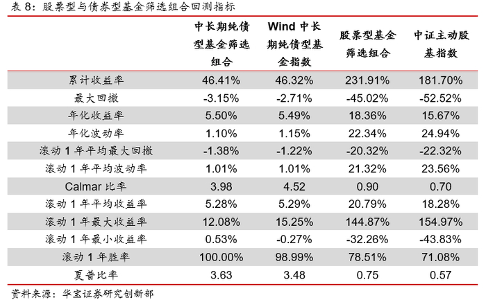 不过,构建的债券基金组合滚动一年胜率达到了100%,滚动一年最小收益0.53%,略高于Wind中长期纯债型基金指数且夏普比率有所提升。