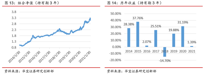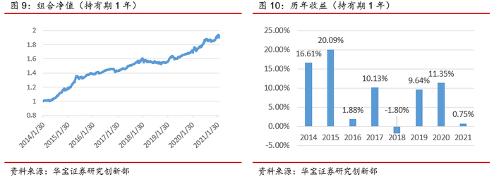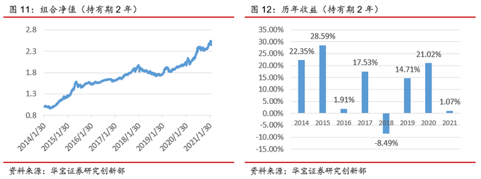 在前文利用基金指数的测试中,滚动两年的胜率为90.6%,收益风险比为9.28,滚动持有两年最低收益为-5.84%,将基金指数替换为具体标的后,滚动两年胜率达到了100%。