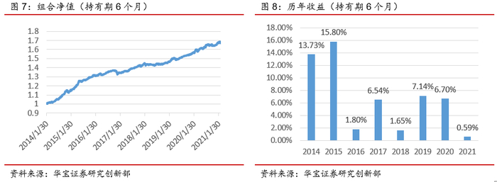 将基金指数替换为具体基金标的后,滚动6个月胜率略有下降,但盈亏比显著提升到了9.82,滚动持有6个月的正收益均值为4%,且最低收益为1.03%。
