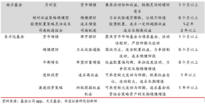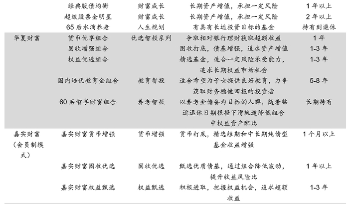 从上表可见,对于大部分风险极低的货币增强型组合,以获取高于货币基金的收益为目的,类比银行理财,建议持有时间通常在1个月以上;对于风险有所提升的稳健增值组合,以固收资产配置为主,通常的建议持有时间在3-6个月;而风险等级为平衡型的产品,可承受一定的波动与回撤,追求较长时间的收益,通常建议持有时间在1年左右;对于积极型与激进型的产品,可以承受较大的波动与回撤,也追求更高的收益,在权益资产上的配置更高,通常建议持有时间在2年左右甚至3年。