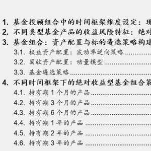 u从回测结果来看,我们认为基于不同时间框架维度构建绝对收益型导向的基金组合,在策略上是可行的。策略构建的核心是要基于不同时间框架维度,测算策略组合在该时间维度下获取绝对正收益的概率以及盈亏比,获取绝对正收益的概率越大,盈亏比越高,策略表现就越优异,越能匹配这一持有时间框架下的投资者需求。在本文中我们也发现,实际上并不需要过于复杂的资产配置策略和基金遴选策略,就可以实现这一目的(本文回测表明所构建的各组合,在各自的持有期下的胜率都达到了90%以上,且多数组合的盈亏比都达到2倍以上)。这相应也意味着净值化时代,以基金组合投资为核心的基金投顾业务,在满足客户投资需求、实现客户资产保值增值方面,发展空间是广阔的。