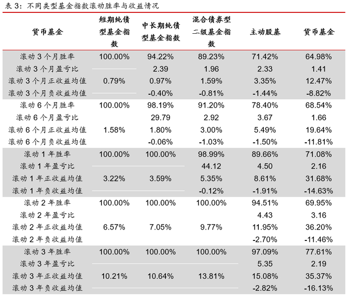 我们选择了几种不同类型的基金指数,包括Wind货币基金指数,Wind短期纯债型基金指数、Wind中长期纯债型基金指数、Wind混合债券型二级基金指数与中证主动股基指数,分别统计了这几类基金指数的收益、回撤、波动率,以及滚动持有3个月、6个月、1年、2年、3年和5年情况下,基金指数的胜率、盈亏比等指标。