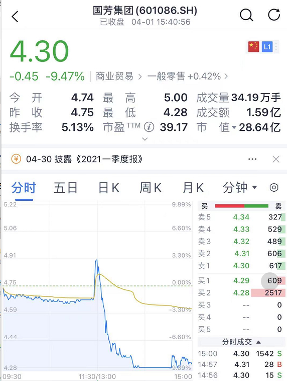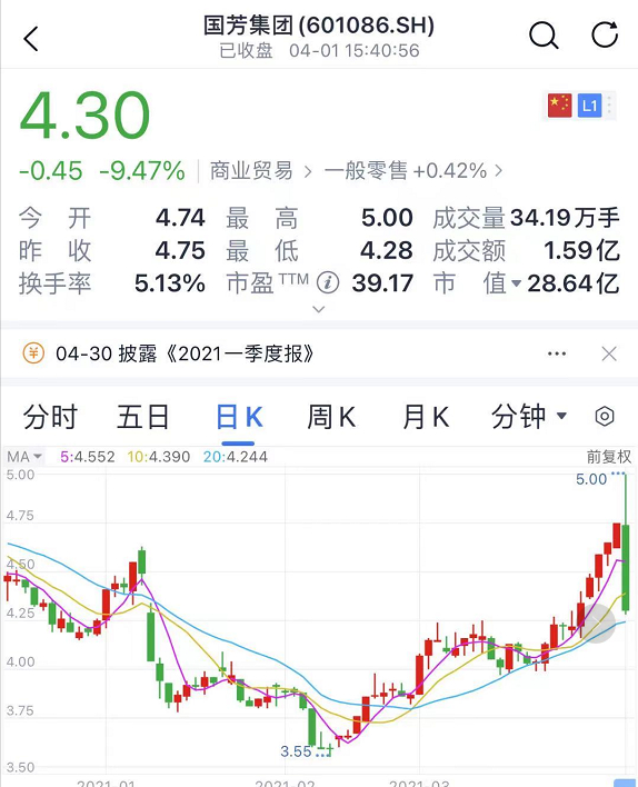 近期,国芳集团的股价从低点的3.55元涨到5元/股,涨幅达40%。最新市值超28亿。