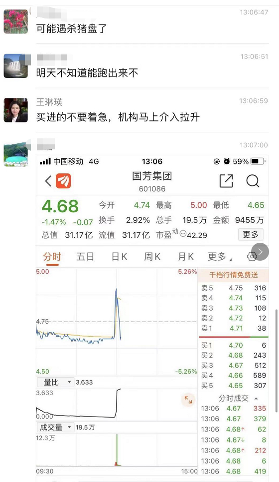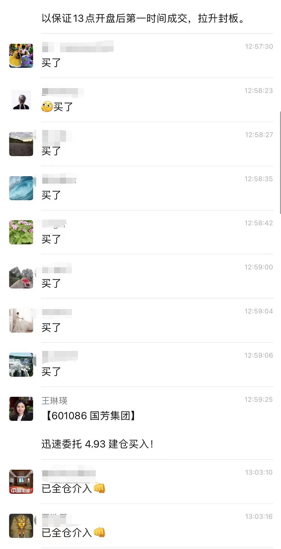 聊天记录显示,一个叫王琳瑛的“美女荐股老师”,在群里喊单,让投资者在下午开盘后以每股4.93元的价格买入国芳集团,说是要准备涨停。