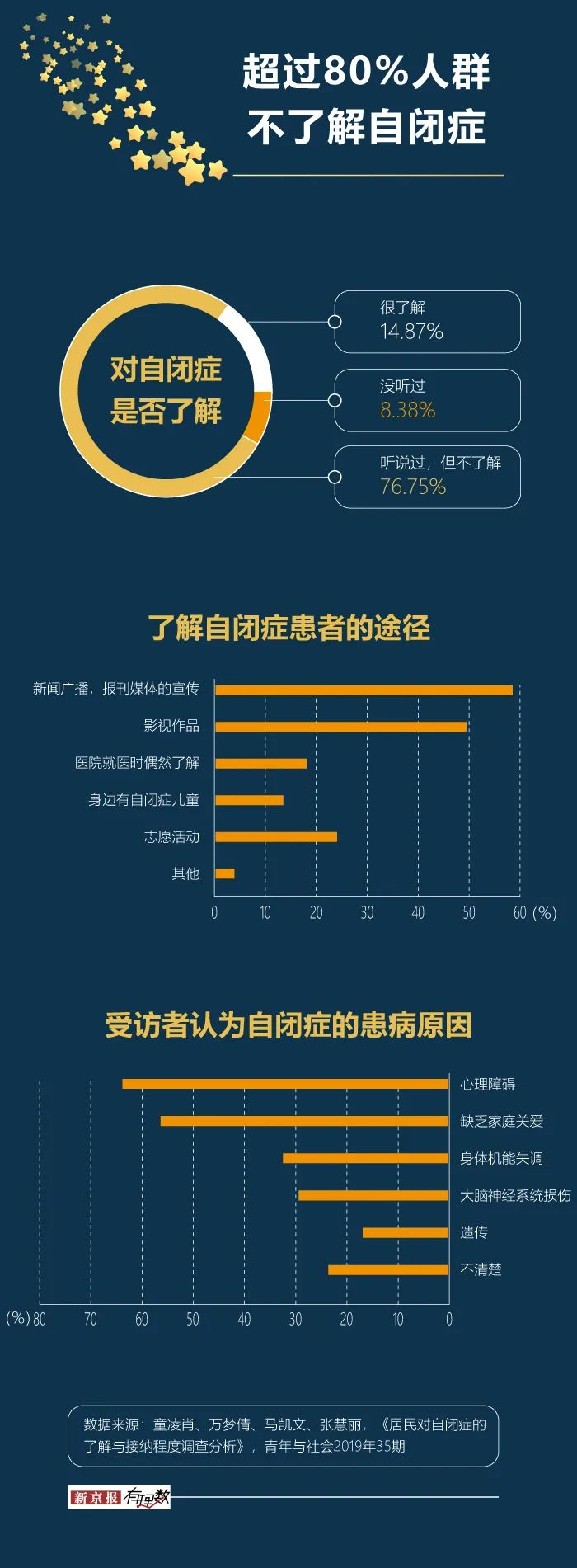 2019年一项调查问卷显示,在日常生活中有85.13%的人群不了解什么是自闭症,其中有8.38%的人群连听都没听过,只有14.57%的人群了解自闭症。人们了解自闭症的途径主要是通过新闻广播、报刊媒体的宣传和影视作品。
