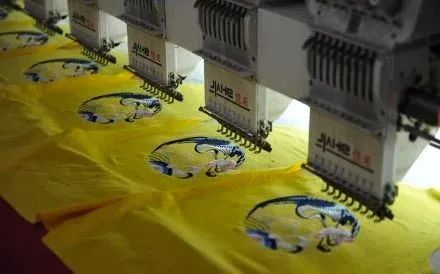 一名女工按下绣花机的按钮,几十个针头立刻整齐划一地开工。不到炸一根油条的功夫,一块块布料就长出了花鸟神兽的图案。