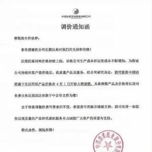 近期,维达、清风、洁柔等国内四家知名纸业公司均发布了调价通知,宣布从4月1日起将上调旗下产品价格。截至目前,市场上部分生活用纸产品价格上调了10%—20%。