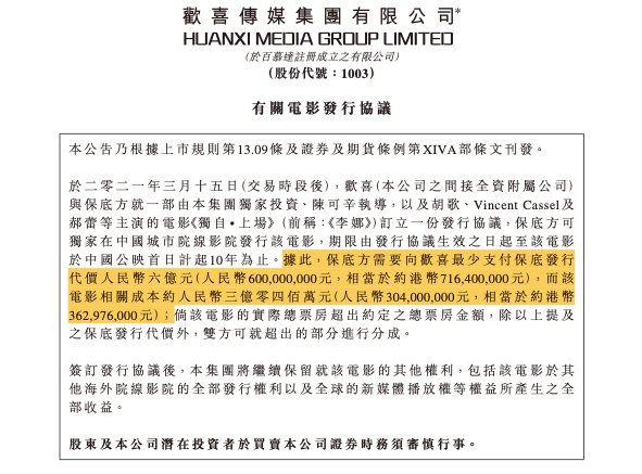 就在年报披露前两个星期,3月15日欢喜传媒发布公告称由陈可辛导演的另一部运动题材影片《独自·上场》(原名《李娜传》)将通过保底的方式发行,欢喜传媒最少将获得保底发行方支付的6亿人民币。
