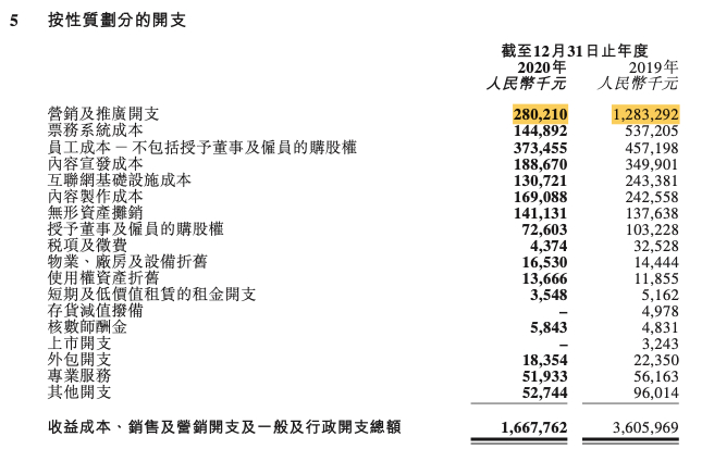 在此前披露的信息中猫眼曾强调“营销及推广费用”主要是对用户的补贴。在猫眼去年财报中的成分拆分表中可以发现,相对于2019年,猫眼2020年的票补成本从13亿跌到了2.8亿,为往年水平的20%左右,而该数据在2018年为17亿。