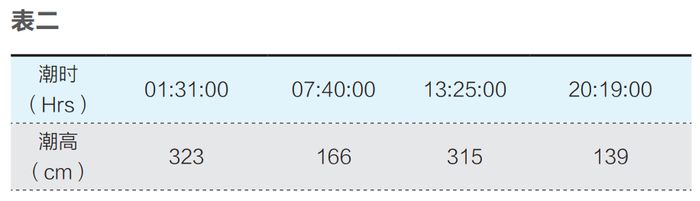 海上电站建设地点为岸线近海,包括大陆岸线及海岛岸线近海,海上电站建设地点以海深超过最低潮位1-2m即可,即在最低潮时不露出海底仍有正常海浪起伏,例如浙江舟山沈家门2021年2月19日潮汐情况(表二)。实际建设中潮汐要以全年最大潮汐潮位为依据,按此推算,海上电站建设海深按平潮最大不超过8m,较海上风电场建设海深5-50m比较海深较浅。