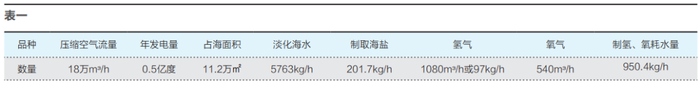 通过曲管换热器中海水量(液面高度)的调整,可以在换热器气流出口得到需要的气流温度,将气流引入房间即可获得空调制冷与制热的效果。蒸馏淡水除生活饮用等外,一部分引入电解槽,利用海上电站自身电力电解水,可在阴极得到氢气,阳极得到氧气,海上电站产品为清洁电力、制冷、制热、淡化海水、海盐、氢气、氧气。以6000kw海上电站为例估算海上电站参数及产品产量(如表一所示)。