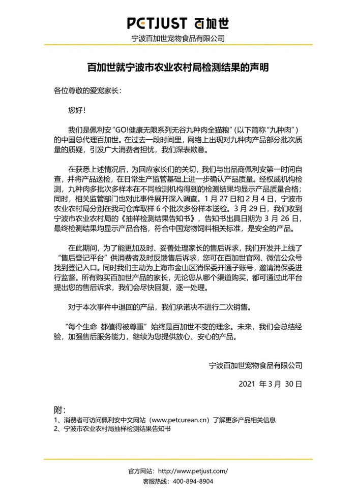在时隔两个月后的3月30日,百加世方面再次发布了《百加世就宁波农业农村局检测结果的声明》,声明显示执法部门对涉事的6个批次的“GO!无谷九种肉全猫粮”进行了抽样,依照农业部公告第1218号、饲料相关标准和《宠物饲料卫生规定》进行检测,每批次样品检测30项指标,所有抽检样品均为合格。