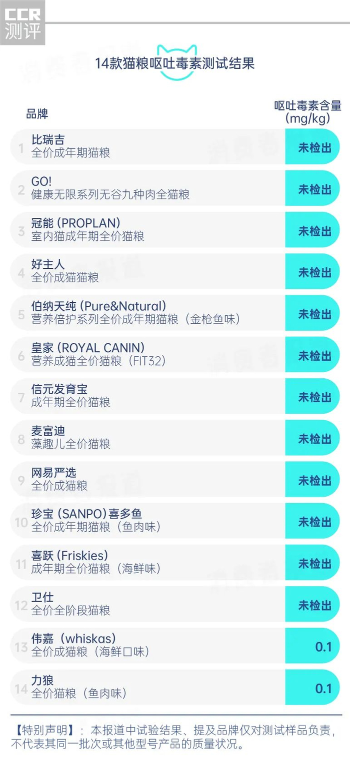 其余12款猫粮均未检出呕吐毒素,包括消费者广泛关注的GO!健康无限系列无谷九种肉全猫粮。