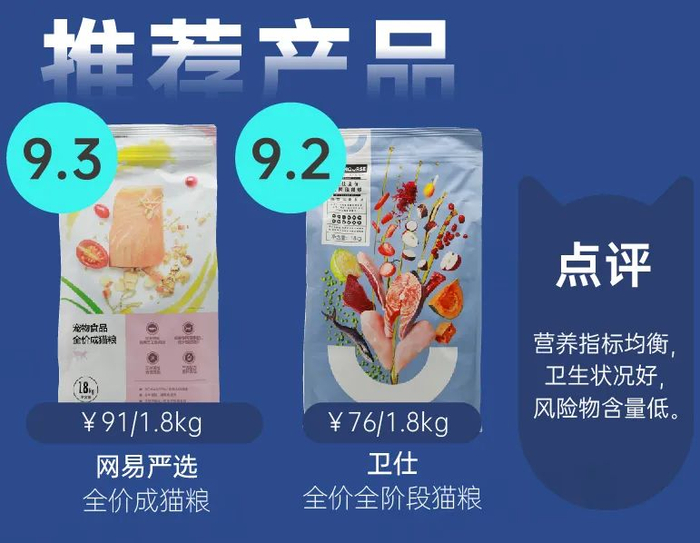 7、综合测评结果显示,网易严选全价成猫粮和卫仕全价全阶段猫粮等2款产品表现较好,CCR得分分别为9.3和9.2;信元发育宝成年期全价猫粮和珍宝(SANPO)喜多鱼全价成年期猫粮(鱼肉味)等2款产品CCR得分垫底,分别为4.5和7.2,被列为不推荐产品。