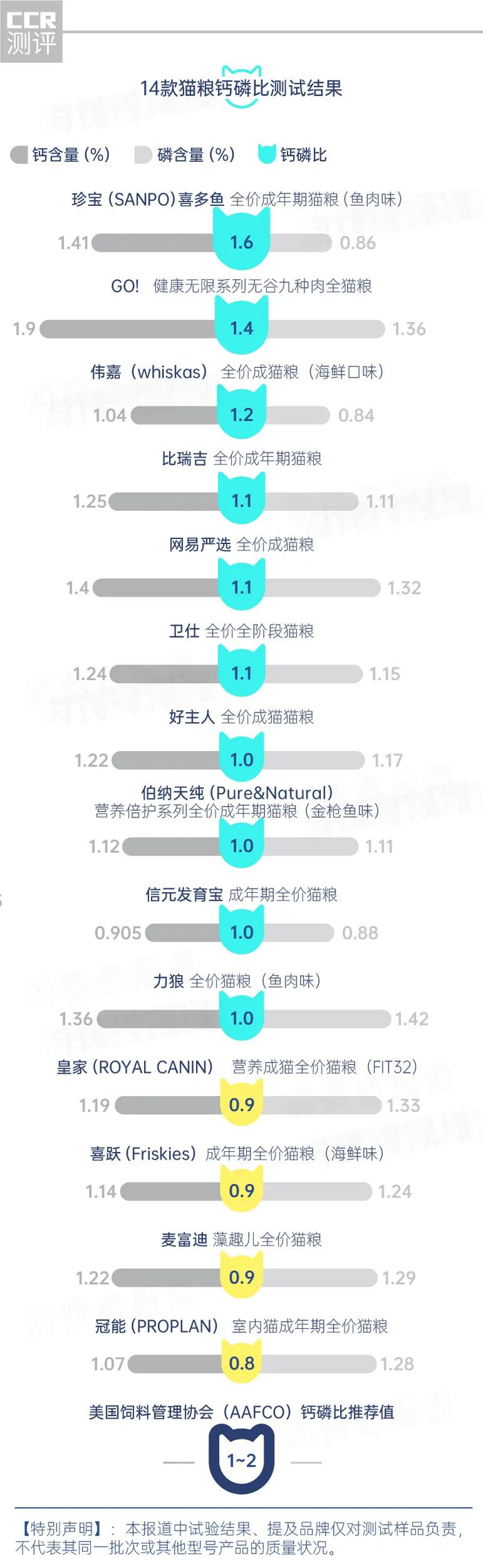 我们建议,消费者可以优先选择钙磷比为1~2的猫粮产品。