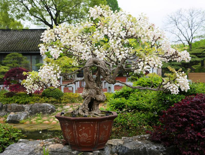 上海植物园盆景园内的白色紫藤盆景