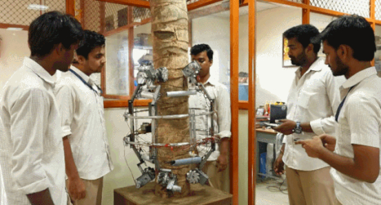 比如下面这个印度科学家发明的自动采椰子机,大家可以感受一下。