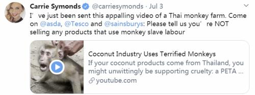 声明中称,泰国椰子制品的包装上将标有编码,可用于追踪产品的生产地,以确认产品是否来自不使用猴子(monkey-free)的种植园。