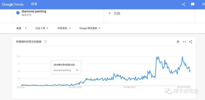 这个站从2017底开始,靠一个Facebook视频广告迅速起量,经过这几年的发展,成为了diamond painting这个品类的Top 1。看一下diamond painting的谷歌趋势图: