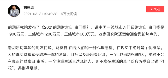 胡锡进发文评论“人生决不能与一个财富数字目标较劲”