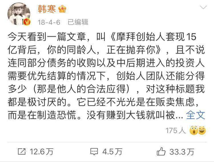 韩寒发微博说某些网文标题“不光光是在贩卖焦虑,而是在制造恐慌”