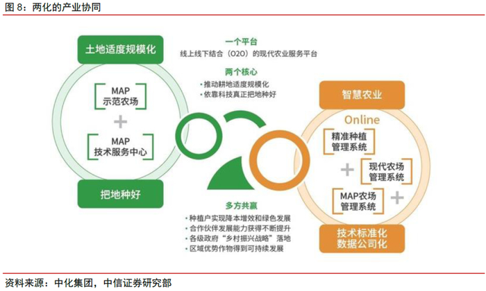 两化合并后,旗下农业、农化公司料将成为中化MAP战略的关键科技支撑。中国化工旗下的农业、农化资产在传统农资产品以及现代智慧农业平台均能为MAP战略提供支持,其种子、农化产品可在示范及技术服务中直接应用,也可将其海外应用成熟的智慧农业平台嵌入中国场景。