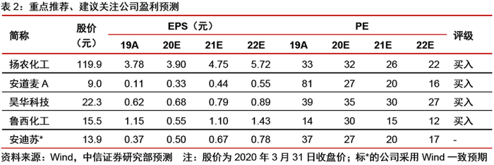 投资策略。两化合并后,预计各板块协同优势将推动旗下上市公司资产形成更加完善的产业链资源共享和技术、销售优势互补,并有望推动两大集团公司提升整体管理水平,我们重点推荐两集团旗下受益整合的优质标的扬农化工、安道麦A、鲁西化工,建议关注中化化肥、沧州大化、沈阳化工、风神股份、安迪苏、倍耐力(PIRC)、Elkem ASA和克劳斯。