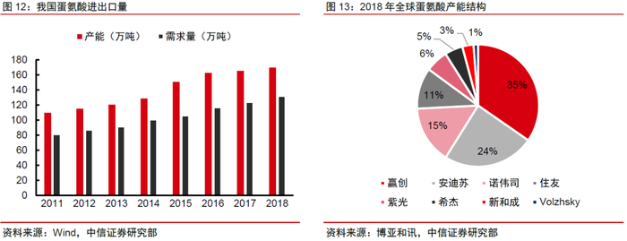 需求稳定增长,长期行业格局持续清晰。80%以上的蛋氨酸用于饲料添加剂中,添加量约为0.1%-0.3%,伴随养殖业体量同步增长。而从供应方面来看,目前国产厂商中只有安迪苏南京、宁夏紫光天化和新和成具备蛋氨酸产能,按我国蛋氨酸需求25万吨测算,中国蛋氨酸仍有较高的进口依存度。对于国内供应商而言,行业格局较为清晰,长期具有较大的渗透率提升空间。