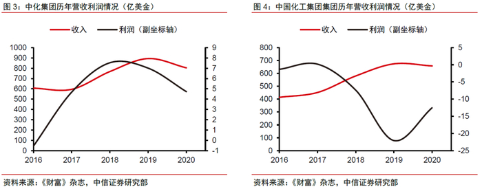 通过本次合并,集团公司整体规模实力将显著提升。在合并之前,中化集团和中国化工集团分别在《财富》全球500强榜单中排在109和164位。从收入水平来看,2020年二者收入分别达到了803亿和657亿美金,已经与全球化工巨头达到相同水平(巴斯夫707亿美金,陶氏化学430亿美金),但是从利润角度来看,仍与其存在较大差距(巴斯夫94亿美金)。