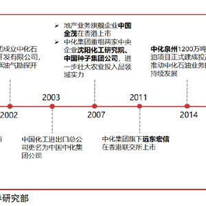 整合背景:涵盖农业、能源、化工等多板块的两家综合性化工央企,重点领域强强联合,部分产业优势互补。中化集团的前身是新中国第一家国营对外贸易公司,于1950年成立。目前,中化集团业务主要涵盖能源、农业、化工、地产、金融五大领域,是最大的农业投入品(化肥、种子、农药)一体化经营企业,中国化工是在中国蓝星(集团)总公司、中国昊华化工(集团)总公司等原化工部所属企业的基础上,经国务院批准于2004年组建而成,有化工新材料及特种化学品、基础化学品、石油加工、农用化学品、轮胎橡胶和化工装备6个业务板块。