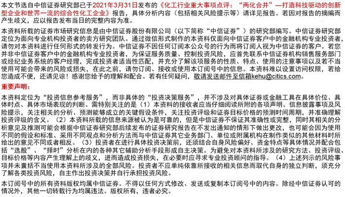 其他更加广泛的业务整合有望持续推进:总体来看,两大集团各有所长,且下属上市公司众多(例如特种化工、基础化工等领域),我们预期,合并完成后,两大集团的其他产业也将进一步进行整合升级,这也将是集团长期发展的重要驱动因素。