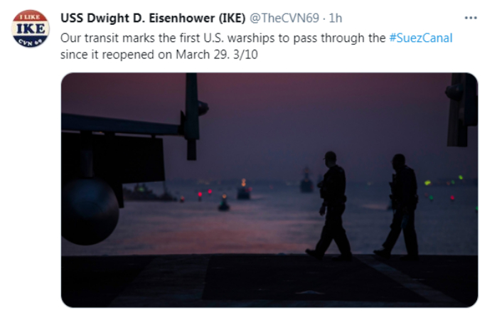 4月3日,美军“艾森豪威尔”号航母战斗群官方推特发文证实,该航母战斗群航行通过了苏伊士运河,“在红海执行任务航行飞越,我们的航母战斗群很激动”。
