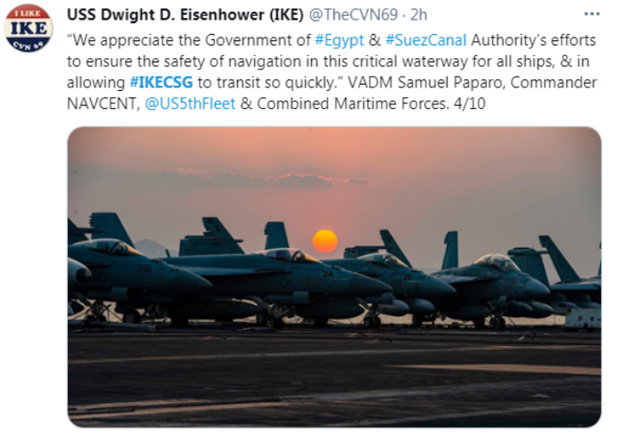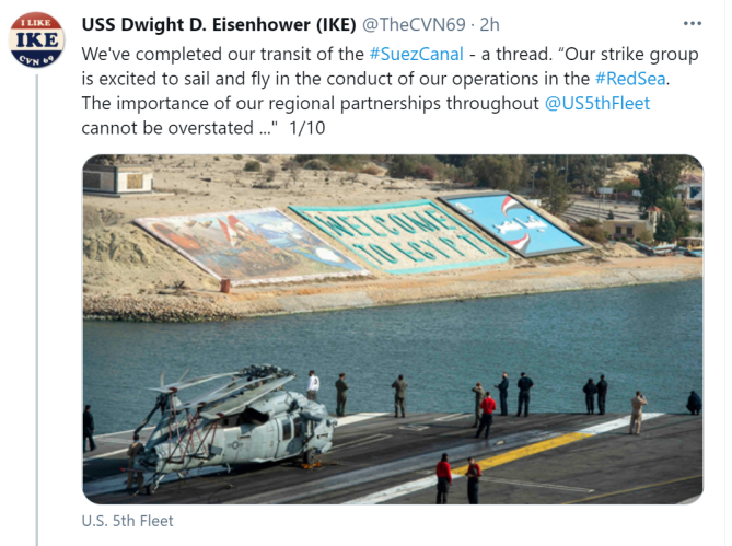 在另外一则推文中,美军“艾森豪威尔”号航母战斗群还对埃及政府及运河管理局表示感谢。“我们感谢埃及政府及苏伊士运河管理局为确保所有船只在这条关键航道上的航行安全所做的努力,使得航空母舰战斗群迅速通过。”↓