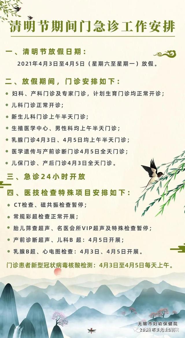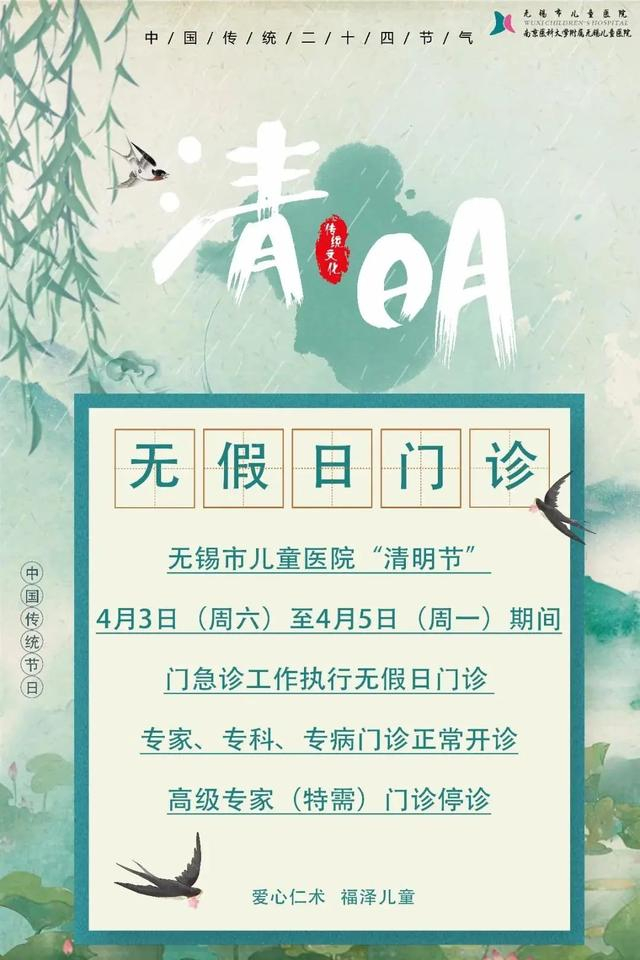 一、医院南院(中山路68号)、北院(兴源北路585号),均在清明假期执行无假日门诊,各类专科门诊按假期排班开诊,其中4月5日(星期一)专家门诊暂停。