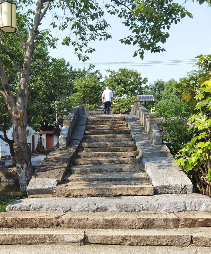 林老桥在古镇北首,始建于建于元代,清(1730年)重建。这座单孔石拱桥,坡度平缓、护栏低矮,保留了宋代石拱桥的姿态。在明清的修缮、维护过程中,石料换成了青石与花岗石,增加了望柱,踏步刻暗八仙图案,堪称是“混搭”高手。