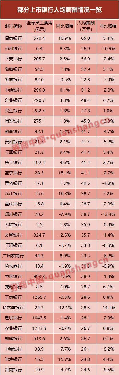 其中,招行以近65万元的人均薪酬位列第一,平安银行人均薪酬近57万元,渤海、浙商、中信三家股份行人均薪酬也在51万元以上。值得注意的是,在港上市的泸州银行人均薪酬略高于平安银行,位列第二。