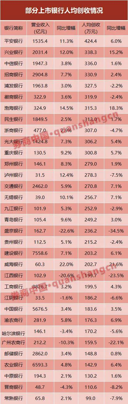 更为重要的是,与高企的人均薪酬相匹配的,是上市股份行、城商行高额的人均产能。