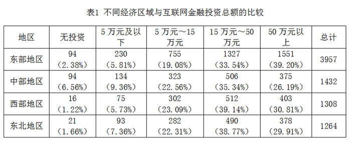 从投资金额看,不同经济区域的互联网金融投资总额有明显差异。经济发达的东部地区互联网金融投资总额占比最高的是50万元以上,占比为39.20%; 其次是15万元~50万元之间,占比为33.54%。而中部地区、西部地区、东北地区的大部分投资人投资总额主要集中在15万元~50万元之间,分别占比为35.34%、39.14%、38.77%; 中部地区与其他经济区域相比,其未参与互联网金融投资人群占比最高,6.56%。可见,经济较发达地区的人群对于互联网金融融资与投资的需求较高,即互联网金融参与度更高。( 见表 1)