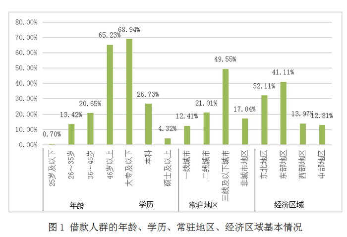 从借款人角度看,绝大多数借款人年龄区间集中在36岁以上,属于中高年龄人群。其中,46岁以上的借款人占比最高为65.23%,36~45岁的借款人群占比为20.65%,25岁及以下借款人群占比仅为 0.7%。从教育水平看,中低学历人群是利用互联网金融进行借款融资的主力军。大部分借款人的学历水平集中在大专及以下学历,占比为68.94%,本科学历占比为26.73%,硕士及以上学历的借款人占比仅为4.32%。从分布地区看,北京、上海、广州、深圳等一线城市的借款人占比仅为12.41%; 多数借款人主要集中在三线及以下城市,占比49.55%; 非城市地区的借款人占比为17.04%,比例较高。从经济区域看,东部地区和东北地区的人群利用互联网金融融资的需求较大,分别为41.11%和32.11%; 而西部地区与中部地区的借款人群占比较低,分别为13.97%和 12.81%。(见图 1)