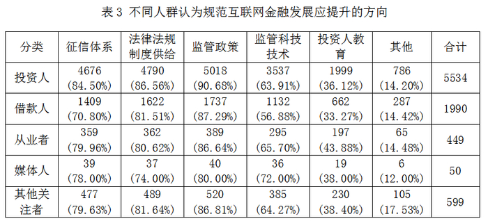 针对互联网金融行业有待改进之处的问题,绝大多数受访者都认为在监管政策、法律法规制度供给和征信体系等方面的建设应进一步完善。其中,投资人与借款人对于监管政策方面的完善反应最为强烈,人数占比分别为90.68%和87.29%。( 见表3) 此外,43.88%的从业者认为投资人教育也亟待改善,比平均水平高出8.38个百分点,而媒体人则更加关注监管科技技术的进步。投资人与借款人作为互联网金融最直接的参与者,更加重视信用风险与欺诈风险对其相关利益的损害可能性。因此,此类人群希望通过完善相关法律法规与征信体系建设、加强监管等手段,降低风险爆发的可能性,保护互联网金融消费者的合法权益。
