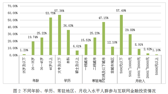 从投资人角度看,36岁以上的人群对于互联网金融的投资参与度最高。46岁以上人群参与投资占 比达53.75%,其中投资额在15万元以上的人群占比高达76.41%; 36~45岁的投资人群,参与投资占比为25.22%。由于中高年龄段人群的适应能力较强,且与年轻群体相比可投资金和投资需求较大,投资经验相对丰富,使该年龄段的人群成为互联网金融投资的主力军。从学历水平看,中低学历人群对于互联网金融的投资参与热情较高。大专及以下学历人群参与投资占比为57.36%,其中投资额在15万元~50万元之间的占比为38.09%; 本科、硕士及以上学历参与投资人群占比分别为36.03%、6.61%。先进的技术手段与金融知识的普及使互联网金融对投资人的文化知识水平及软件操作技能的要求不断降低,中低学历人群亦可通过简洁的操作获得快捷的金融服务。从收入水平看,中低收入人群对互联网金融的投资参与度较高。月收入为10000元以下的投资人群占比高达87.37%,远高于其他收入人群,其中月收入为5000元以下的人群占比超过半数,为57.49%。从常驻地区看,三线及以下城市及非城市地区是互联网金融的投资密集区,占比为59.25%。互联网金融的投资人不再局限于一二线城市,而是逐渐向三四线城市下沉,乡村地区的人群也逐步体验到互联网金融带来的便利性。( 见图 2)