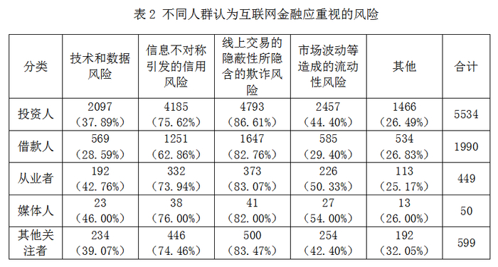 对于互联网金融中存在的风险,受访者普遍认为由信息不对称引发的信用风险与线上交易的隐蔽性所隐含的欺诈风险是最值得关注的两类风险。其中,不同类型受访者中选择欺诈风险的人数占比均超过八成,选择信用风险的人数占比大多超过七成。值得注意的是,借款人群中选择因市场波动等因素导致的流动性风险的人数占比为29.40%,比平均水平低10.95个百分点,而通常认为市场波动只对投资人有影响。此外,媒体人对技术和数据风险与市场波动等造成的流动性风险也有较高关注度,占比分别为46%和54%。( 见表 2)